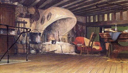 « Abondamment figurée en peinture, la cuisine apparaît comme un lieu majeur dans toute habitation. Si sa représentation diffère d’une œuvre à l’autre selon qu’il s’agit d’un espace spécifiquement affecté aux tâches culinaires dans une maison aristocratique ou d’un coin de l’unique pièce des maisons villageoises, la cuisine et sa cheminée concentrent des activités diverses. Les enfants y trouvent souvent un espace de jeu, les vieilles personnes une source de chaleur et un lieu de convivialité, tandis que les femmes y travaillent une grande partie de la journée. C’est pourquoi, dans les images, elle forme un univers complet et cohérent et nous donne à voir un intérieur dans son intimité2. »