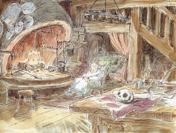 Je ne sais pas vous, mais cette vieille femme, tout de bleu vêtue, me rappelle le personnage de Mamie Sophie du film le Château Ambulant. D’ailleurs, dans ce long métrage de Ghibli, le feu (le personnage de Calcifer) occupe une place très importante pour la bonne marche du Château et la vie de ses occupants. Mais il n’est pas le seul : c’est Sophie qui répare les problèmes causés par le sorcier Hauru, qui nettoie son château laissé en piteux état et recueille même la Sorcière des Landes qui lui a pourtant lancé un bien mauvais sort de vieillesse, quand celle-ci retrouve sa véritable forme : celle, justement, d’une très vieille femme sénile et toute décrépite. (Depuis combien de temps est-ce que je vous promets de finir mon article sur ce film ? Je ne sais même plus moi-même.)