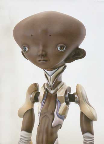 | Qu'est-ce que Inochi ? C'est sans doute l'un des personnages les moins connus de l'oeuvre de Takashi Murakami par le grand public mais également l'un des plus original. Ce petit androïde, inspiré des robots de A.I., Intelligence Artificielle, de S. Kubrick, selon l'artiste lui-même, a l'apparence d'un enfant-robot ou d'une marionnette, sorte de Pinocchio des temps modernes et permet à l'artiste de s'interroger sur le monde et d'interroger celui-ci. Les questions ne sont pas toujours d'un grand sérieux mais il n'empêche que son célèbre "what will be the human beauty of the future ?" pourrait être une excellente problématique, à l'heure où tout un chacun recherche à tout prix la perfection dans l'être humain par définition perfectible. | >